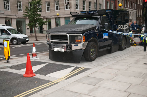 Apparently the Met has a number of these heavily armoured vehicles, based on a Ford F350 truck chassis with bullet-proof windscreens & blast-proof flooring, using them around Heathrow and to carry the specialist firearms officers of CO19 - they can hold around 6-8 officers. These Jankel armoured Guardian TIV (Tactical Intervention Vehicles) come from a firm based in Weybridge, Surrey though it also has strong connections with Jordan. Company founder Robert Jankel, who died in 2005, was earlier noted for his sports and luxury car designs.