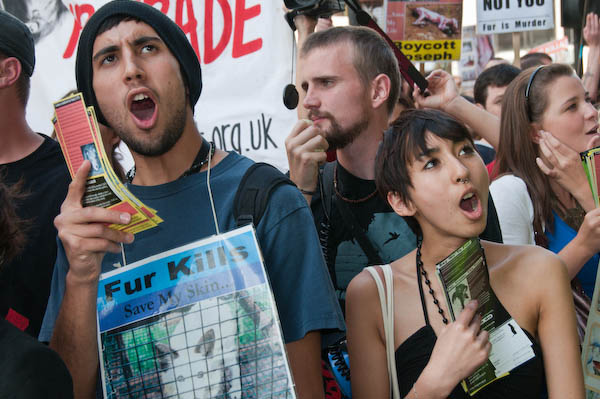 The march, organised by the Campaign Against the Fur Trade targeted the Knightsbrige shops of "Gucci, Prada, Escada, Versace, Fendi, Joseph, Armani and Burberry, as well as the notorious Harrods, the only department store in the UK still selling real fur."
