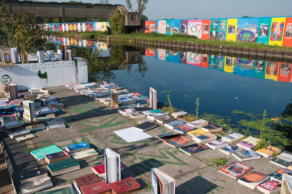I started at Leabank Square, a Campbell, Zogolovitch, Wilkinson and Gough (CZWG) development from 1988 around a central grass square, already showing its age, next to Gainsborough School. I think there was once a dye works on the riverside site, though the map I saw was a little vague. It has its own short bit of riverbank onto the Lea Navigation, where they were selling books and also tea and scones. I also found some very thorny brambles growing there by walking through them.