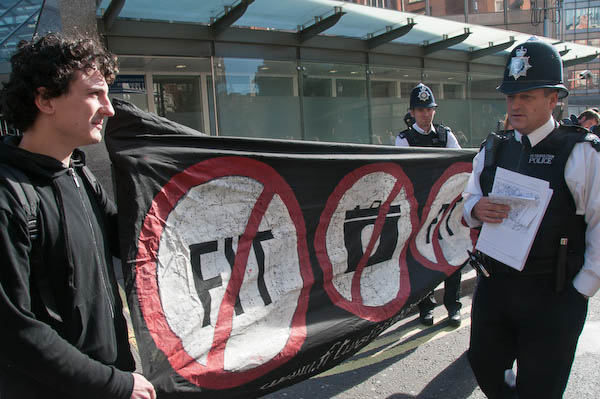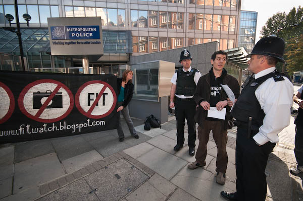 The Fitwatch banner outside New Scotland Yard - and the policeman with some SOCPA notices