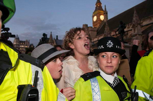 Tamsin Osmond looks jubilant as the Climate Rush reaches the Houses of Parliament