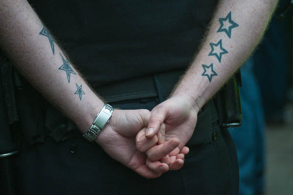 ![]() Police are starting to form a ring around the protesters in front of the station |