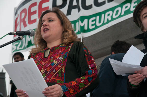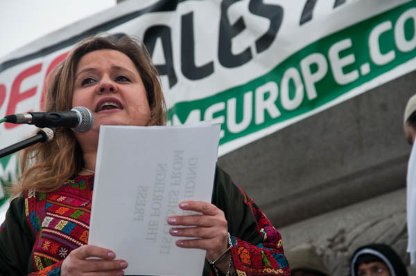 ![]() Palestinian singer Reem Kelani who grew up in Manchester speaks before singing a traditional song |