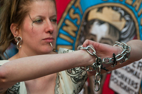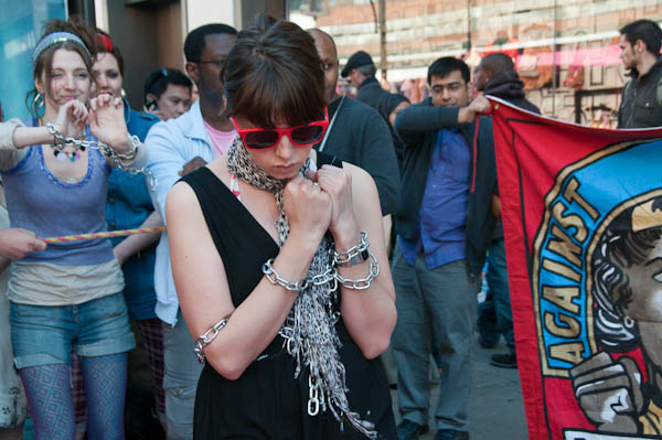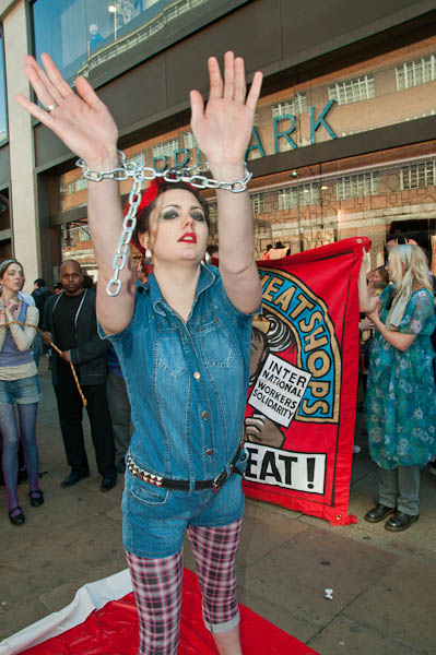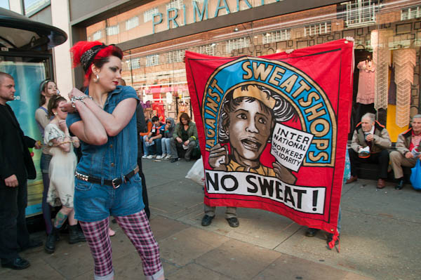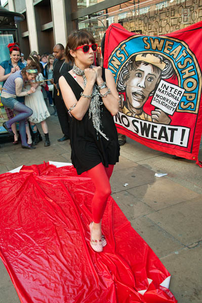 As the models paraded, shoppers were told of workers in Bangladesh being paid 7p an hour and working 80 hour weeks