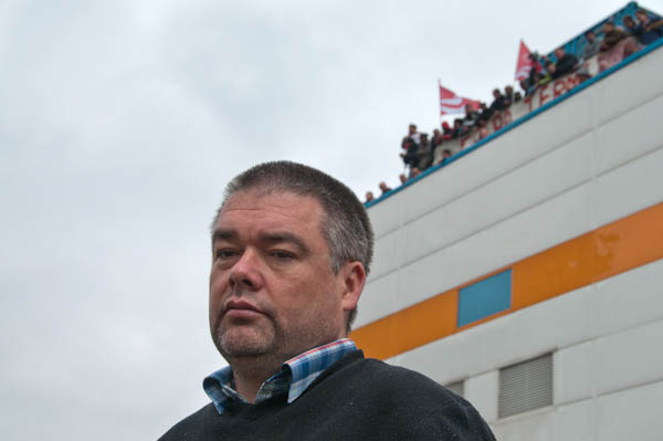 Unite's convenor at Visteon, Kevin Nolan with workers behind him on the roof