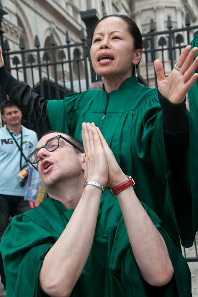 Reverend Billy and the Life After Shopping choir perfrom on the pavement outside Downing St - where police allow no protests