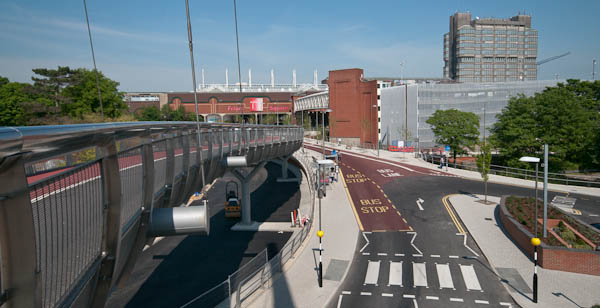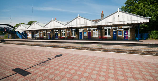 with a rather strange pedestrian/cycle bridge across the railway and a very ugly modern shopping centre