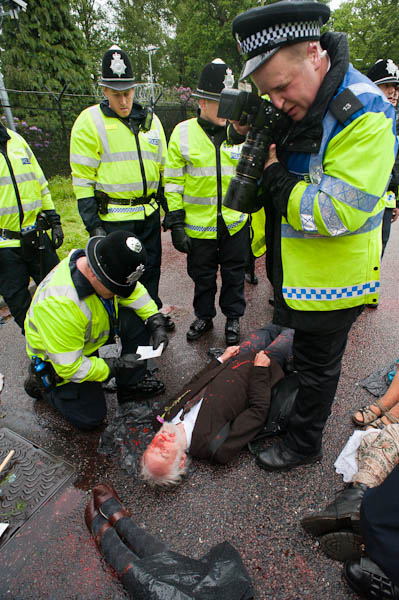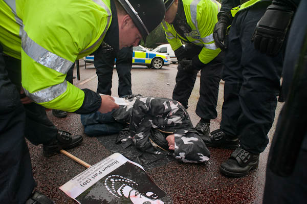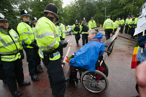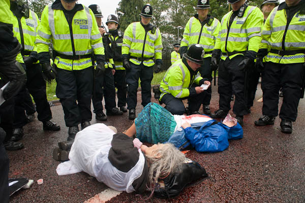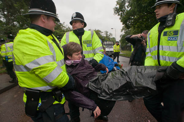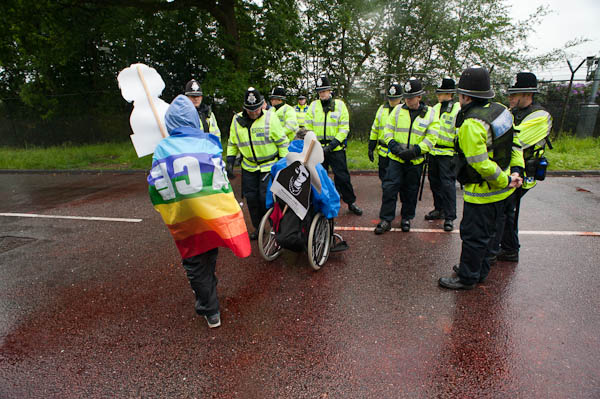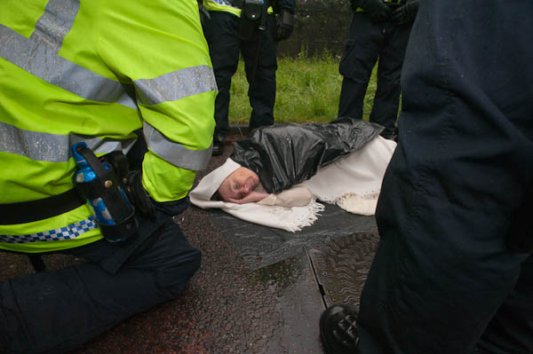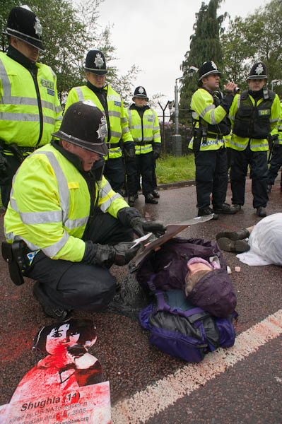 and I could only photograph from the verge. A few minutes after the road was cleared the protesters - apart from the six arrested - were allowed to march down the road back to the station, where I found my bike and cycled home through the rain.