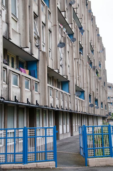 Left: one of a few remaining older buildings at the east end of Poplar High St.      Right and below: Robin Hood Gardens