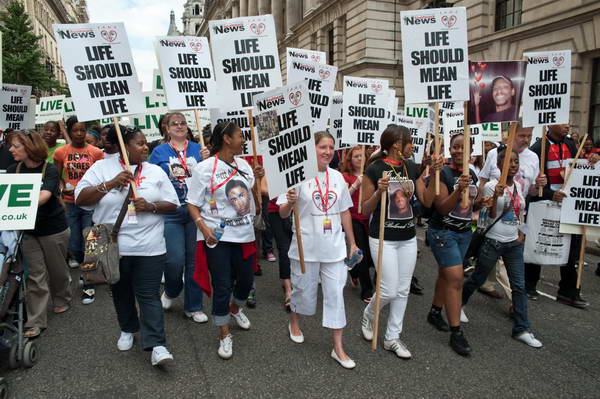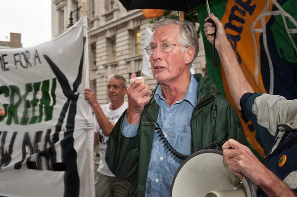 The rally outside the Department of Energy and Climate Change in Whitehall on Thursday evening started in light rain, but it was pouring by the time it finished. Despite the weather, the 80 or so present listened intently to speeches from a Vestas worker, trade union speakers from the RMT, PCW and Billy Hayes of the Communications Workers Unions, as well as former Labour Secretary of State for the Environment Michael Meacher MP and Green Party GLA member Jenny Jones, who arrived at the event by bicycle.