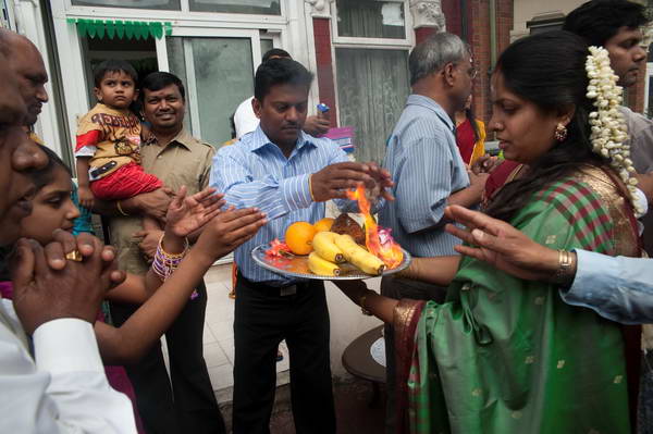A highly decorated chariot carrying images of Hindu Gods (including the Goddess Gayatri) left the temple early on Sunday morning and made its way slowly around the streets of East Ham in a traditional 'Ther' festival, followed by perhaps 5000 people, mainly members of London's Tamil community. Along the route men and women stood in front of their homes and businesses with plates or baskets of fruit to hand to the temple priests riding on the chariot or walking in front for blessings by the Goddess; metal trays bearing fruits were returned bearing a flame and the families held out their hands to feel the warmth.