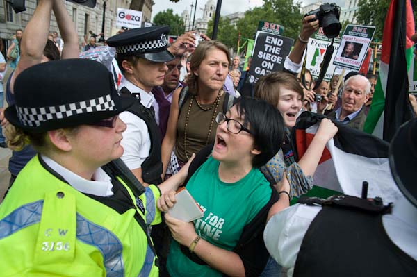 Although the police had managed to clear a small area of pavement in front of the Downing St gates, this was at the expense of blocking much of one side of the road with a larger crowd of demonstrators, and soon traffic had to be stopped. The noisy demonstration continued, with a smaller group including ant-zionist rabbis still protesting on the 'legal' side of the road. There were occasional bouts of shoving as some protesters walked around or through the rather thin police line, but in general it was a good natured demonstration and one elderly and confused woman waving an Israeli flag was treated kindly by protesters - and she had been there around an hour before a police officer insisted it might be a good idea to for her to put the flag away in her handbag.