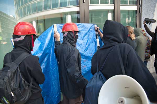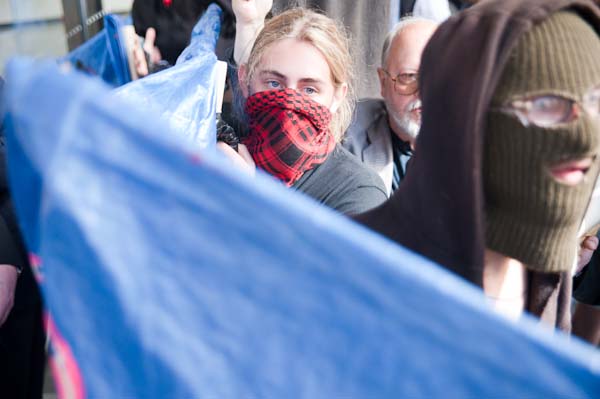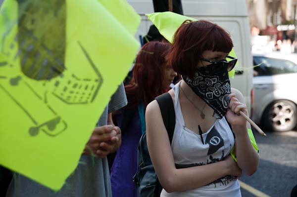 ![]() A young woman harangues lunchtime workers who are laughing at the protest |