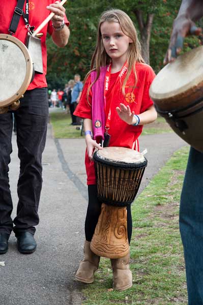 Alice asks people to help her find the rabbit hole for the rabbits. And a young drummer from the Psalm band