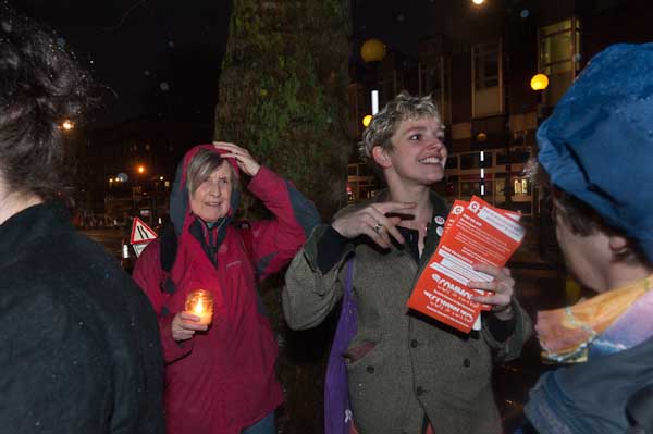 Tamsin hands a leaflet to a couple sheltering from the rain