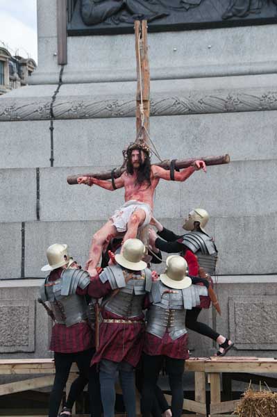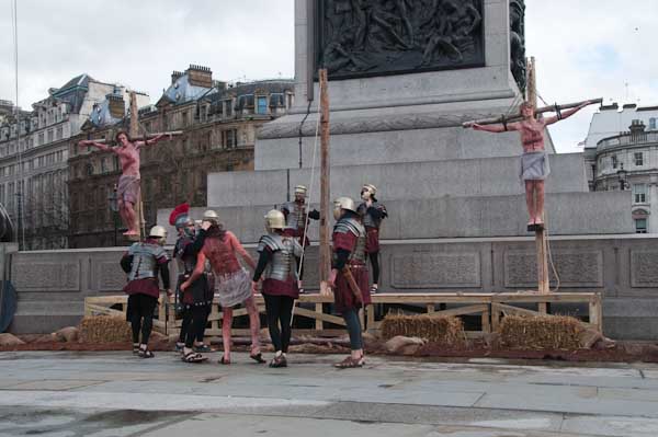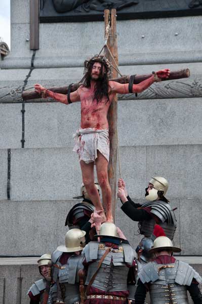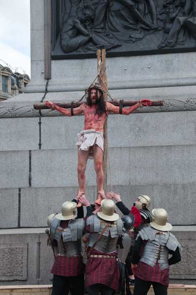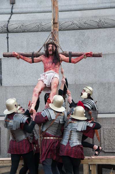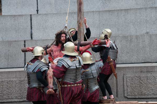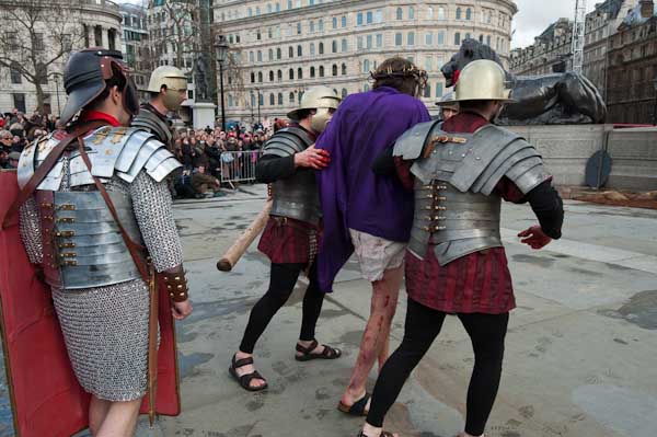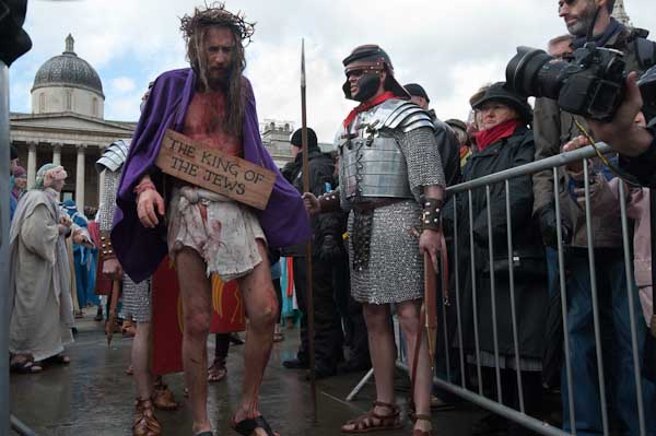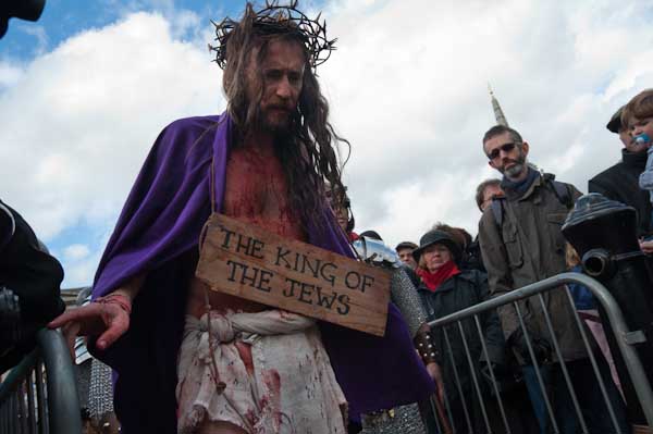 Jesus is brought to be crucified wearing a crown of thorns and a board 'The King of the Jews'