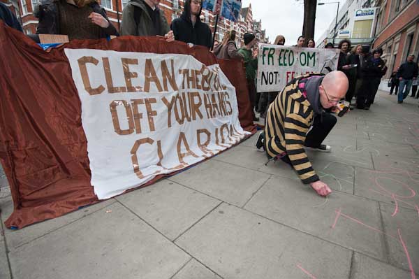 The protesters were leaving the pavement clear but it seemed a good place for a slogan