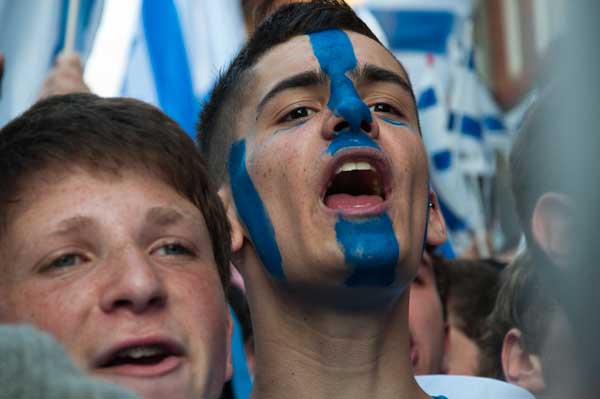 One young man in the crowd with blue paint on his face, the colour of the Israeli flag