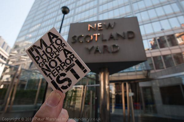 ![]() Holding up the 'I'm a photographer not a terrorist!' card at New Scotland Yard ![]() ![]() ![]() Posing for the man from Reuters ![]() Very hard to get more than one flash firing in a picture ![]() |