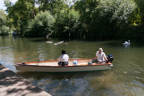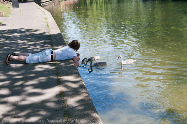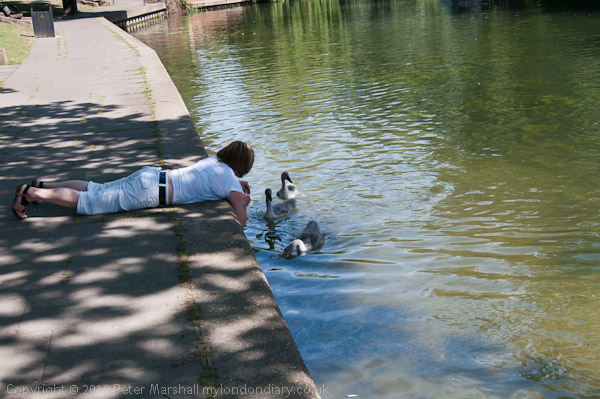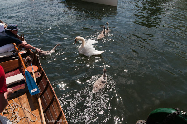 ![]() ![]() ![]() ![]() Later the Swan Warden and his helpers try to catch a fifth cygnet from the family, missing earlier ![]() A few days previously there had been seven cygnets ![]() cygnets are not easy to catch even when you entice them with bread ![]() Eventually they caught the cygnet just off the old swimming area at the Lammas, but I could not follow them there as it was closed to the public for a group photograph. |