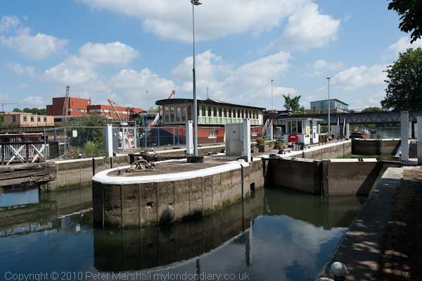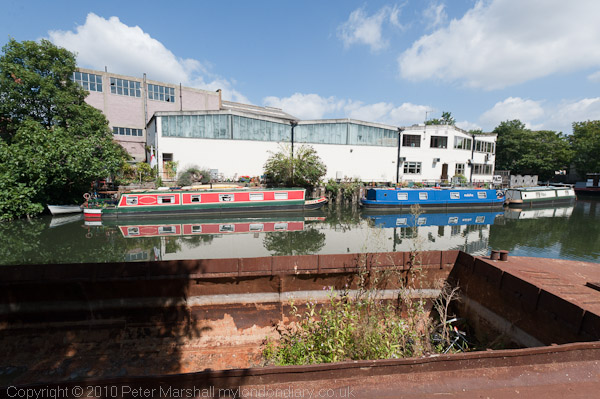 ![]() A small dock just above the locks ![]() ![]() The disused railway line used to serve Brentford Dock on the Thames ![]() One of several fairly derelict wharves ![]() ![]() Thames Lock, connecting the canal system to the River Thames ![]() Looking up the canal - on the right a large boat is on land at the edge of another dock |