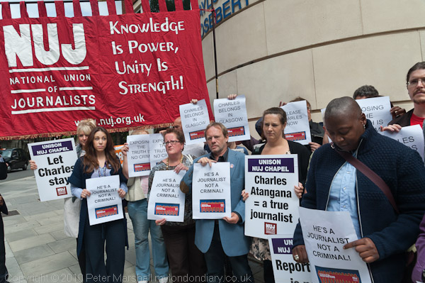 Many of the placards have the NUJ 'Stand up for Journalism' Logo