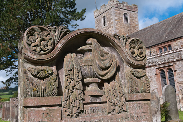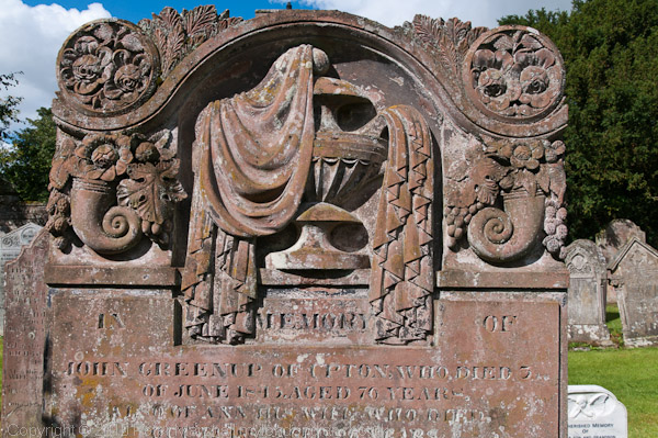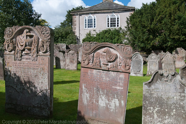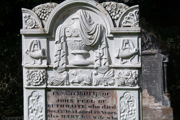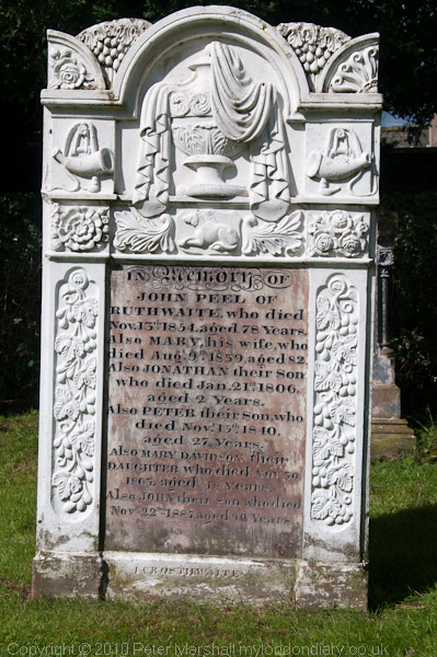 John Peel's buried with a hound and two horns on his gravestone in 1854