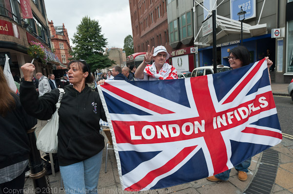 The US Stars and Stripes combined with the Union Jack by 'Team Infidels' with the message 'Never Forget 9/11'