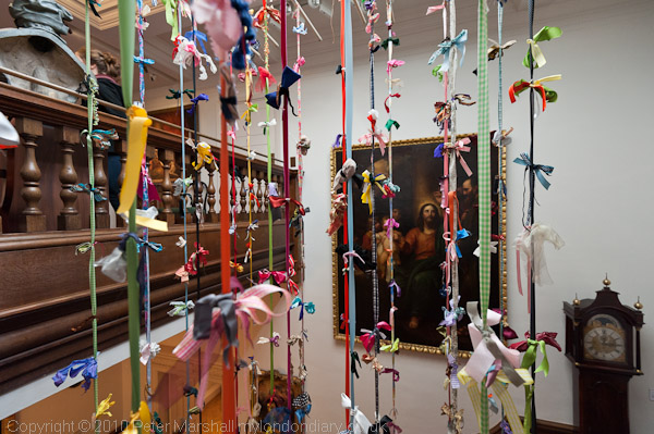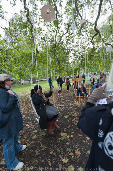 Chairs and lampshades hanging from a tree in Brunswick Square Gardens