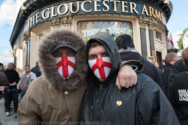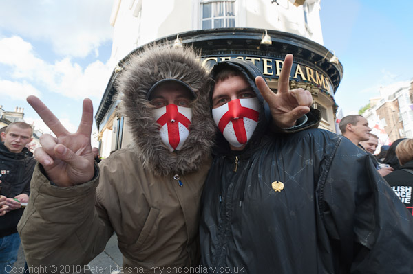 ![]() ![]() ![]() ![]() Two men pose in EDL St George's masks ![]() ![]() |