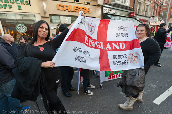 Two women hold the North Herts EDL flag
