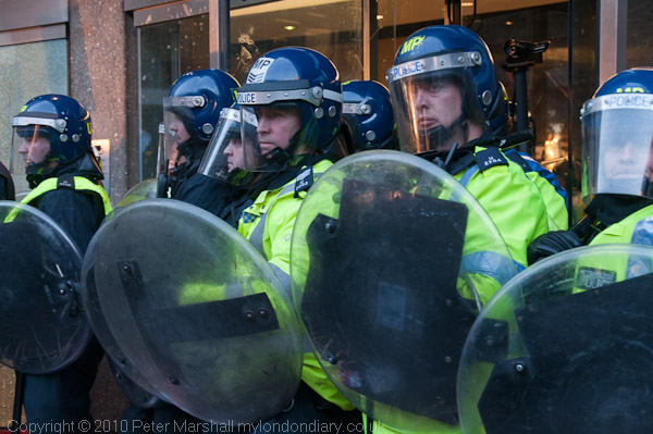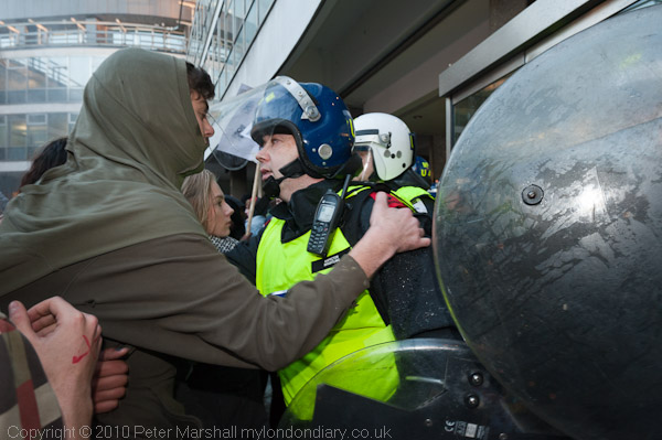 a stick from a placard is thrown towards the police - it bounces off the raised riot shield