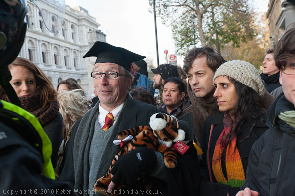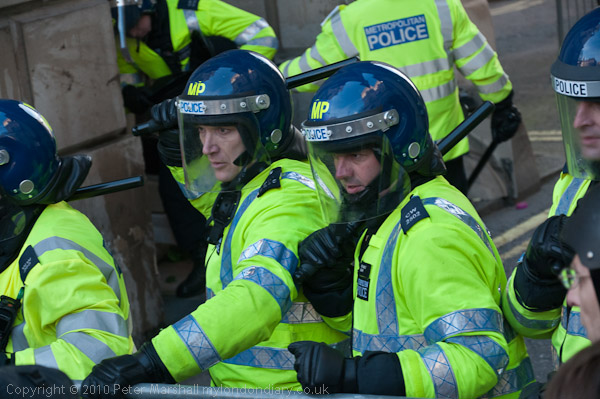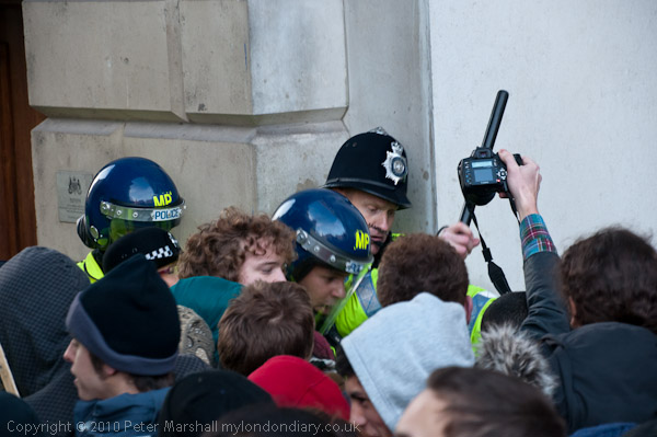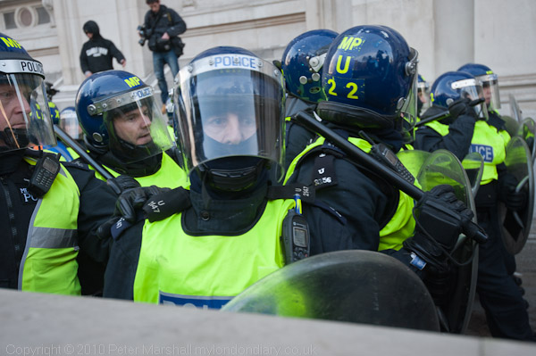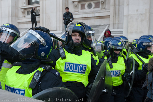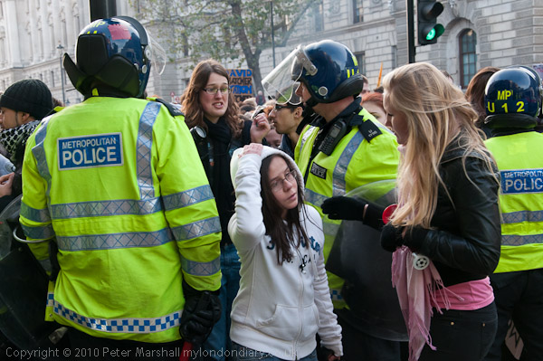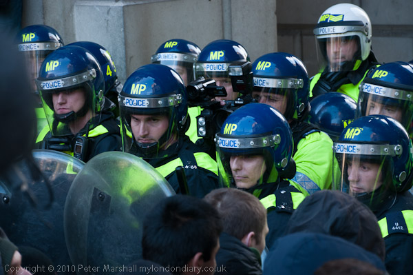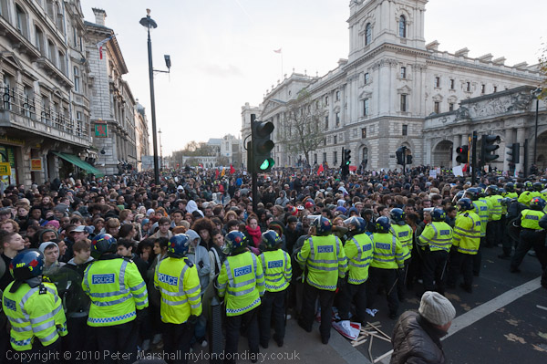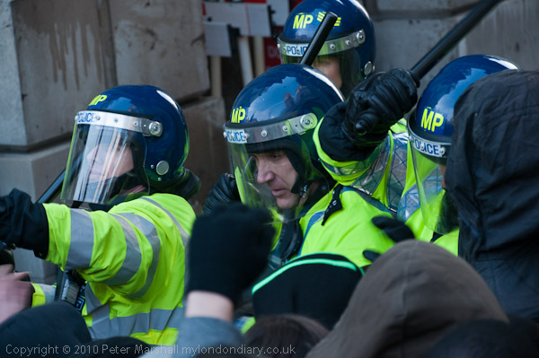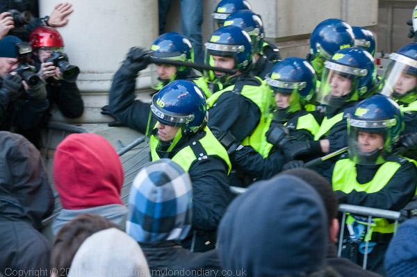 Outside the kettle, riot police were charging more demonstrators and pushing them backaway from the protest