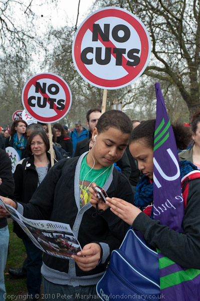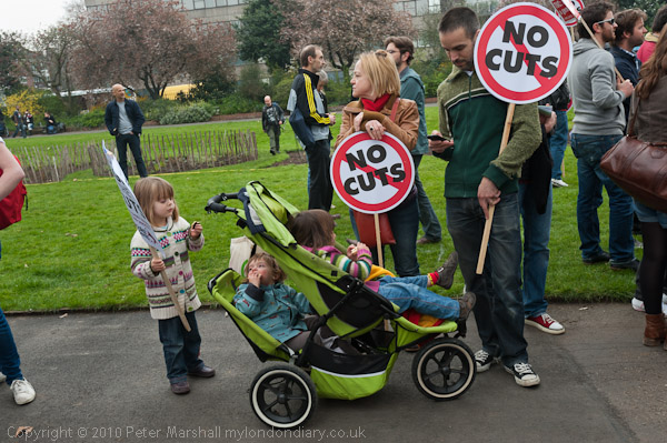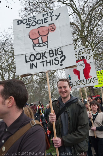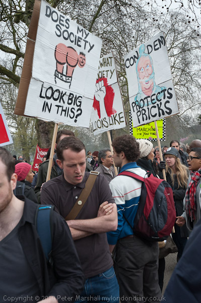 Some of the more provocative placards including 'Does My Society Look Big in This?' and 'Con Dem Protects Pricks'