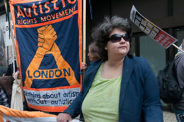 Autistic Rights Movement London and RIght to Work banners along with Socialist workers placards against the cuts