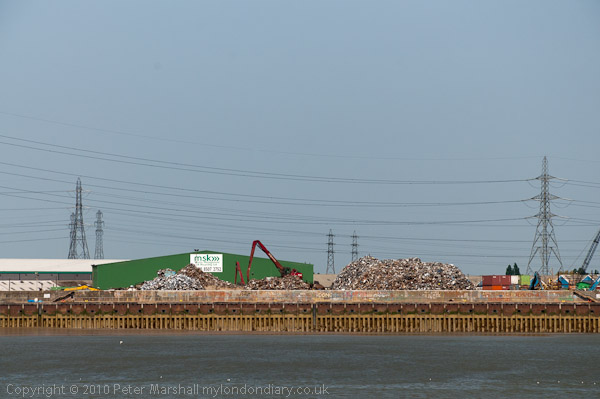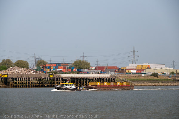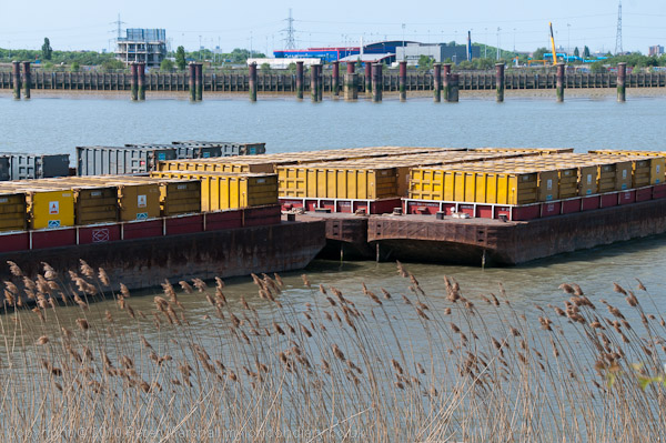There are glimpses of the river and these waste transfer barges though trees and over bushes