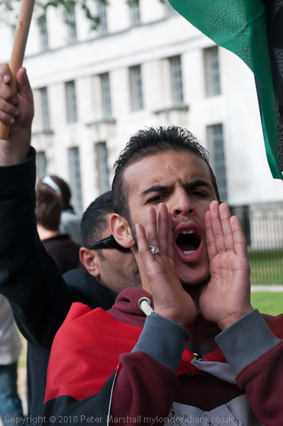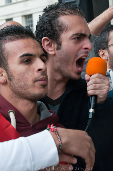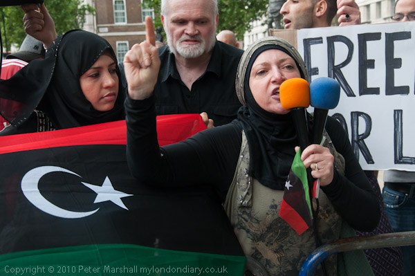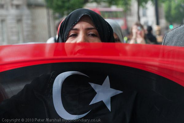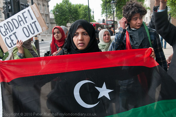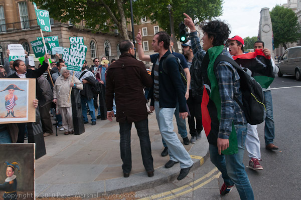 Another small group of Libyan opposition supporters arrives and walks past the Stop the War demo
