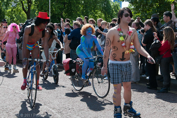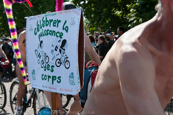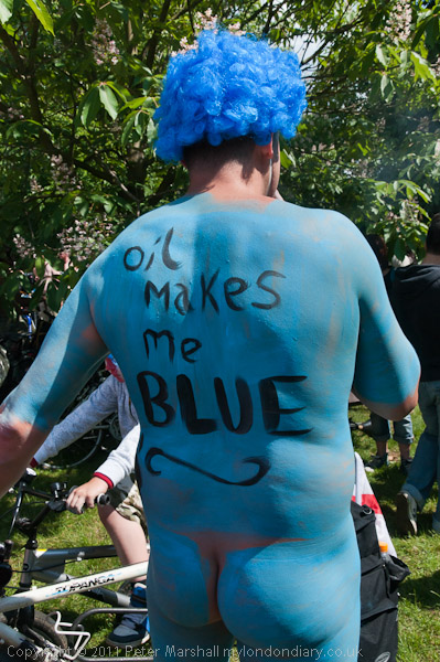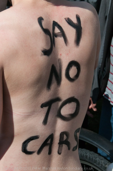 Relatively few of the riders had slogans on their bodies or bikes - such as 'Pedal Not Petrol!' and 'Body Freedom'