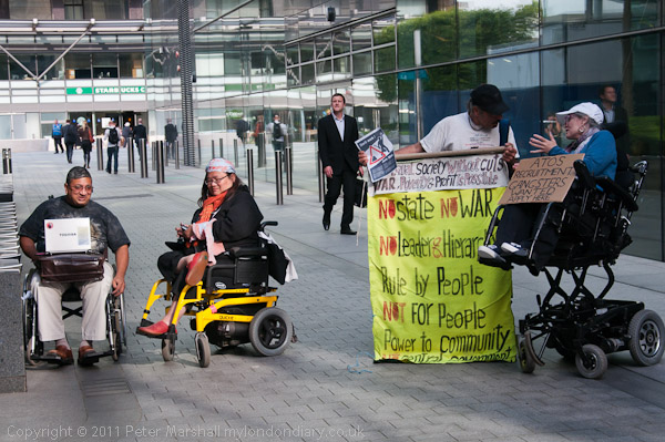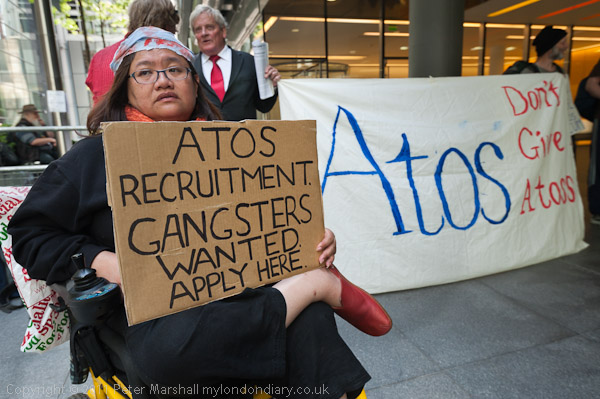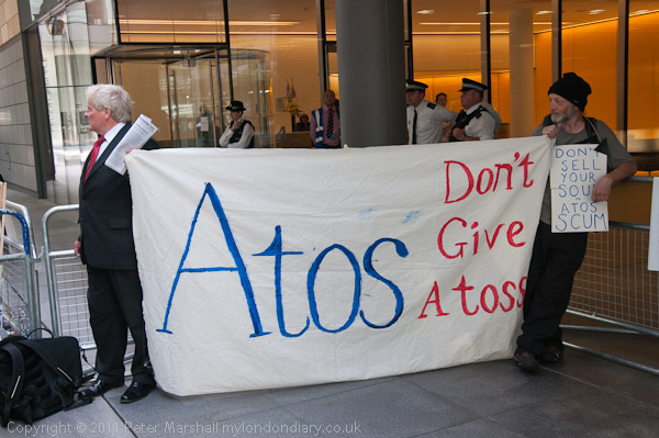 'Atod Recruitment. Gangsters Wanted. Apply Here' and 'Atos Don't Give A toss' banner outside the offices