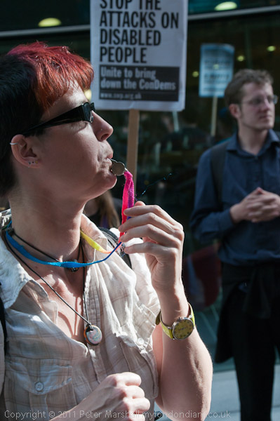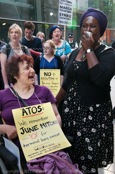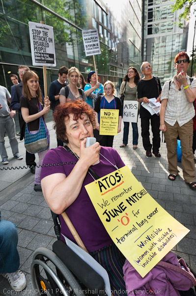 Clare from WinVisible speaking, with placards about June Mitchell, dying from lung cancer but entirely fit for work according to Atos testers