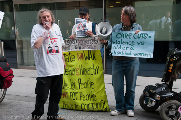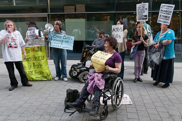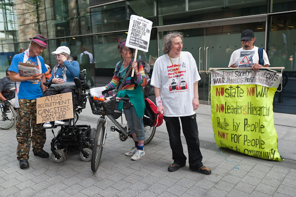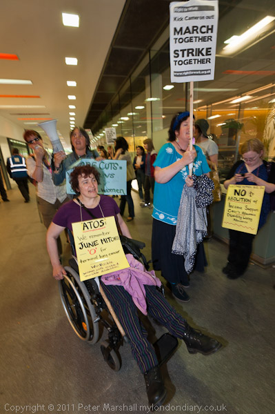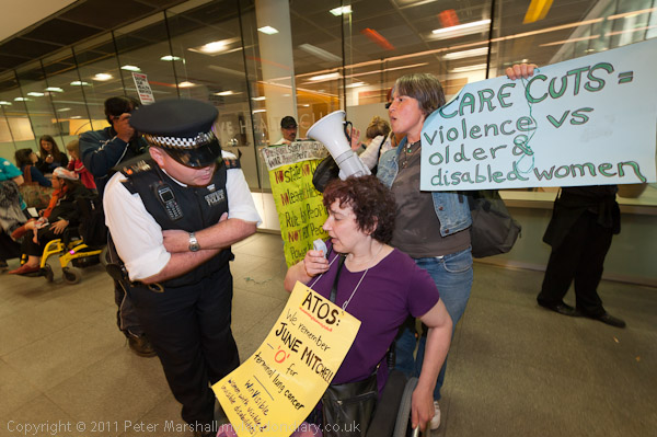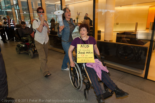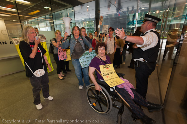 Protesters decide to walk around the barriers and carry on outside the shared reception for the Atos offices