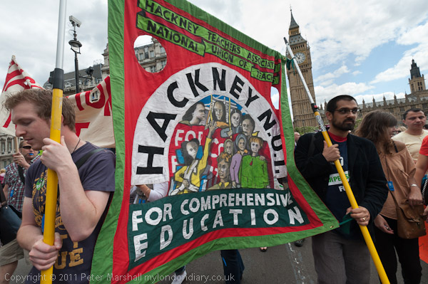 Hackney teachers banner in Parliament Square with Big Ben behind them