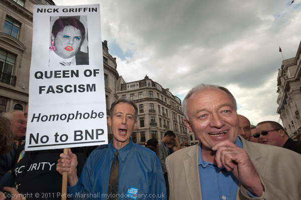 Peter Tatchell with his Nick Griffin 'Queen of Fascism' poster, calling him a homophobe and saying 'No to BNP' at the head of the march