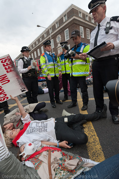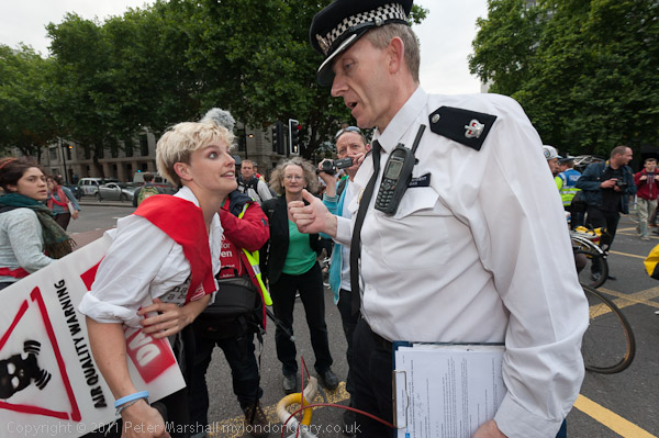 Police photograph the protest and warn Tamsin that she will be arrested if people do not leave the road