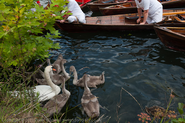 Finally they are close enough to try and grab the swan and cygnets, though it would be easy to fall in