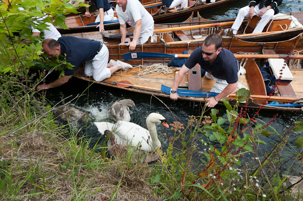 One of the Royal uppers has come on land and down the steps and grabs the female swan around its neck
