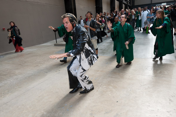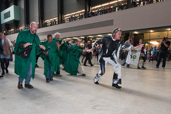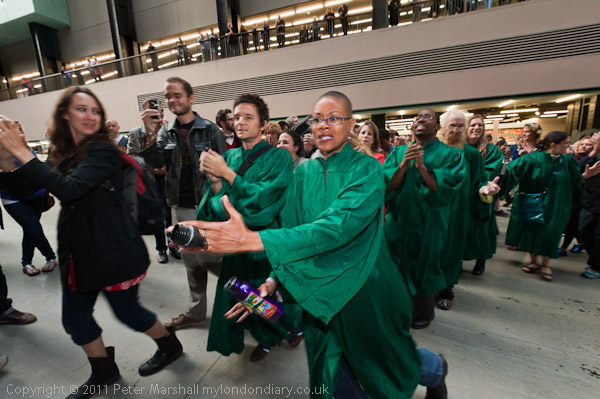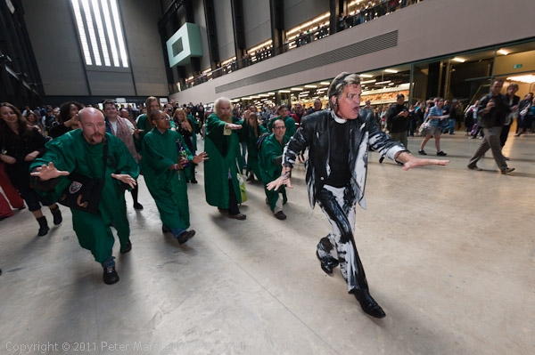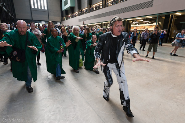 Rev Billy rises to join the congregation as they parade in a circle in the Turbine Hall