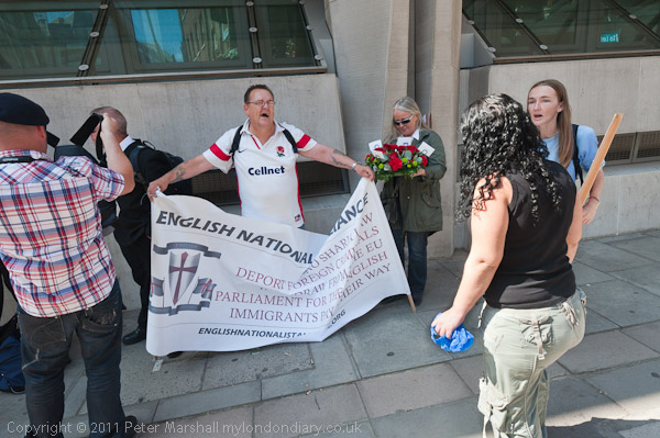 This small protest was in marked contrast to the events taking place in the City of London, where later police arrested around 60 of the EDL. Here the protesters made their protest in a quiet and generally dignified manner, apart from one small incident where English Nationalist Alliance leader Bill Baker got out his megaphone to shout at the Syrians demonstrating opposite Downing St against the repression of dissent in Syria, apparently under the misconception that they were Islamic extremists he told them to go back to Syria nad make their protests in their own country.