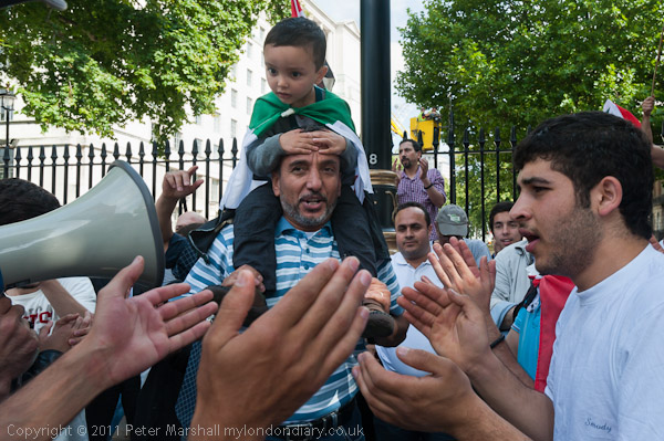 Around a hundred members of the Syrian Community in London protested at Downing Street, calling for further sanctions and diplomatic pressure to support the peaceful protests in Syria against the Assad regime and to bring freedom and democracy to their country.