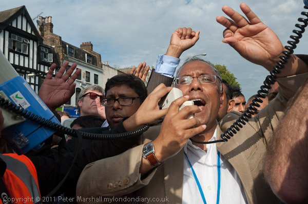 Th march stopped outside the East London Mosque, but activists moved the front of the councillors and continued along the road. They were then briefly stopped by a line of police who told them that what they were doing was illegal as there was a ban on marches in the area, but the marchers were in no mood to stop. Some simply walked around the side of the police line, while others pushed their way through the heavily outnumbered police.